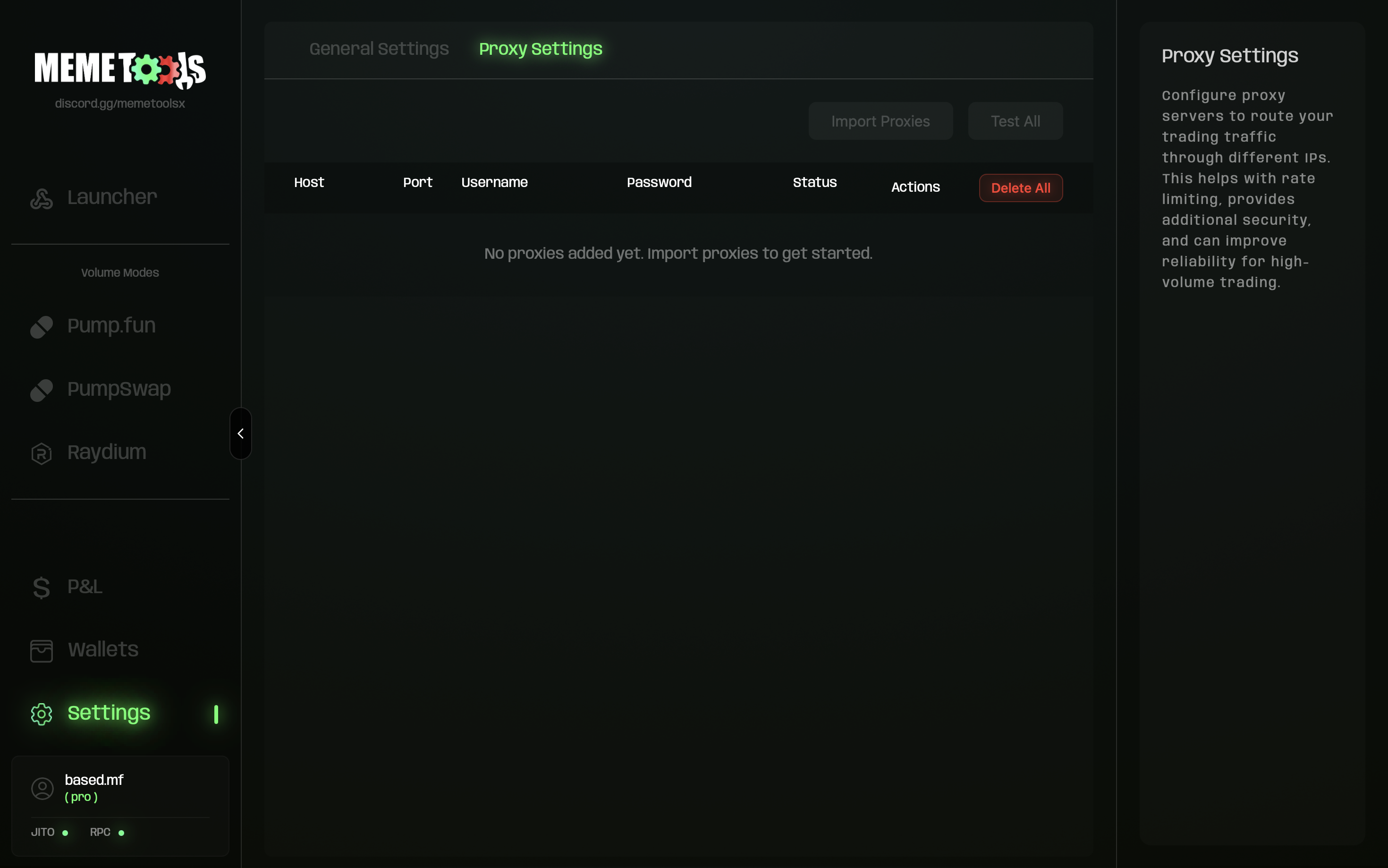 **Proxy Mode** is a high-anonymity bundling option in MemeTools that routes wallet transactions through imported proxy IPs. This prevents IP clustering, bypasses rate-limits, and adds a layer of stealth to your sniping and buying operations — ideal for high-volume or sensitive launches.